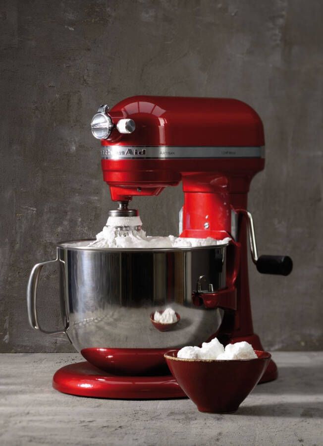 KitchenAid mixer Artisan, 5KSM7580X. Deze mixer onderscheidt zich van de andere KitchenAid keukenrobots door de in de hoogte verstelbare kop en de grotere mengkom van 6,9 liter; ideaal voor zware ladingen en grote hoeveelheden. De planetaire mengbeweging en de directe aandrijving zorgen ervoor dat de ingrediënten tot de boord van de kom homogeen geroerd worden. Met de volledige metalen constructie, metalen precisie-tandwielen en metalen controleknoppen is uw Kitchen Aid 5KSM7580X keukenrobot met 1,3 pk motor stabiel, geruisloos en duurzaam. De snelheidsregelaar kan op tien standen naar eigen behoefte worden ingesteld voor het kloppen van eiwitten, het kneden van brooddeeg, enz. Zijn robuust metalen body zorgt voor een lange levensduur en een geruisloze werking. Een ander voordeel van de KitchenAid keukenrobot is dat deze zich tijdens het gebruik niet op het werkblad zal verplaatsen. Zowel beginners als gastronomen zullen de KitchenAid multifunctionele mixer waarderen voor zijn aparte bereidingscapaciteiten. Deze KitchenAid Artisan set bestaat uit de mixer, een platte menghaak, een kom met ergnomisch handvat, een deeghaak, een draadgarde en een schenkschild. Deze accessoires zijn vaatwasbestendig.